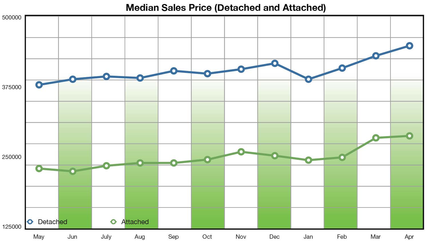 The median sales price for condos and townhomes, for April, was $288,500. This is up 37.380% from last year.